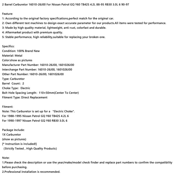2 Barrel Carburetor 16010-26J00 For Nissan Patrol GQ Y60 TB42S 4.2L 88-95 RB30 3.0L 6 90-97
