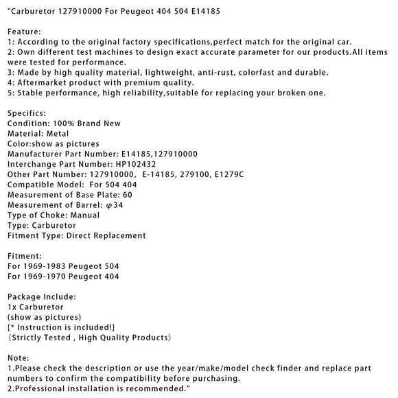 Carburetor 127910000 For Peugeot 404 504 E14185