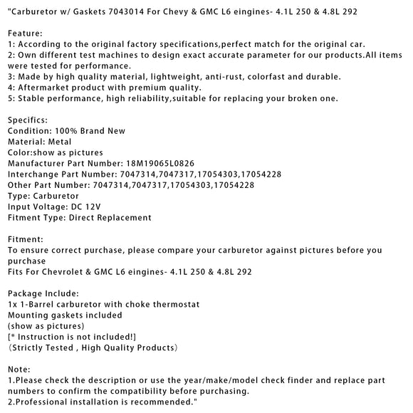 Carburetor w/ Gaskets 7043014 For Chevy & GMC L6 eingines- 4.1L 250 & 4.8L 292