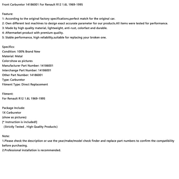 Front Carburetor 14186001 For Renault R12 1.6L 1969-1995